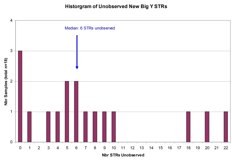 Unlike the Sanger sequencing techniques used for FTDNA Y-12, Y-37, Y-67, and Y-111 products, the Next-Gen sequencing technology used in the Big Y production may not yield results at some positions / portions of the Y-chromosome. When the results for a particular marker are not reported, we refer to it as an Unobserved marker. The histogram below shows the frequency of Unobserved STR results among the new STR markers within results for the Larkin Ancestry Set. The median number of Unobserved markers was six (6) markers per sample with a range of 0 to 22 markers across all participants.